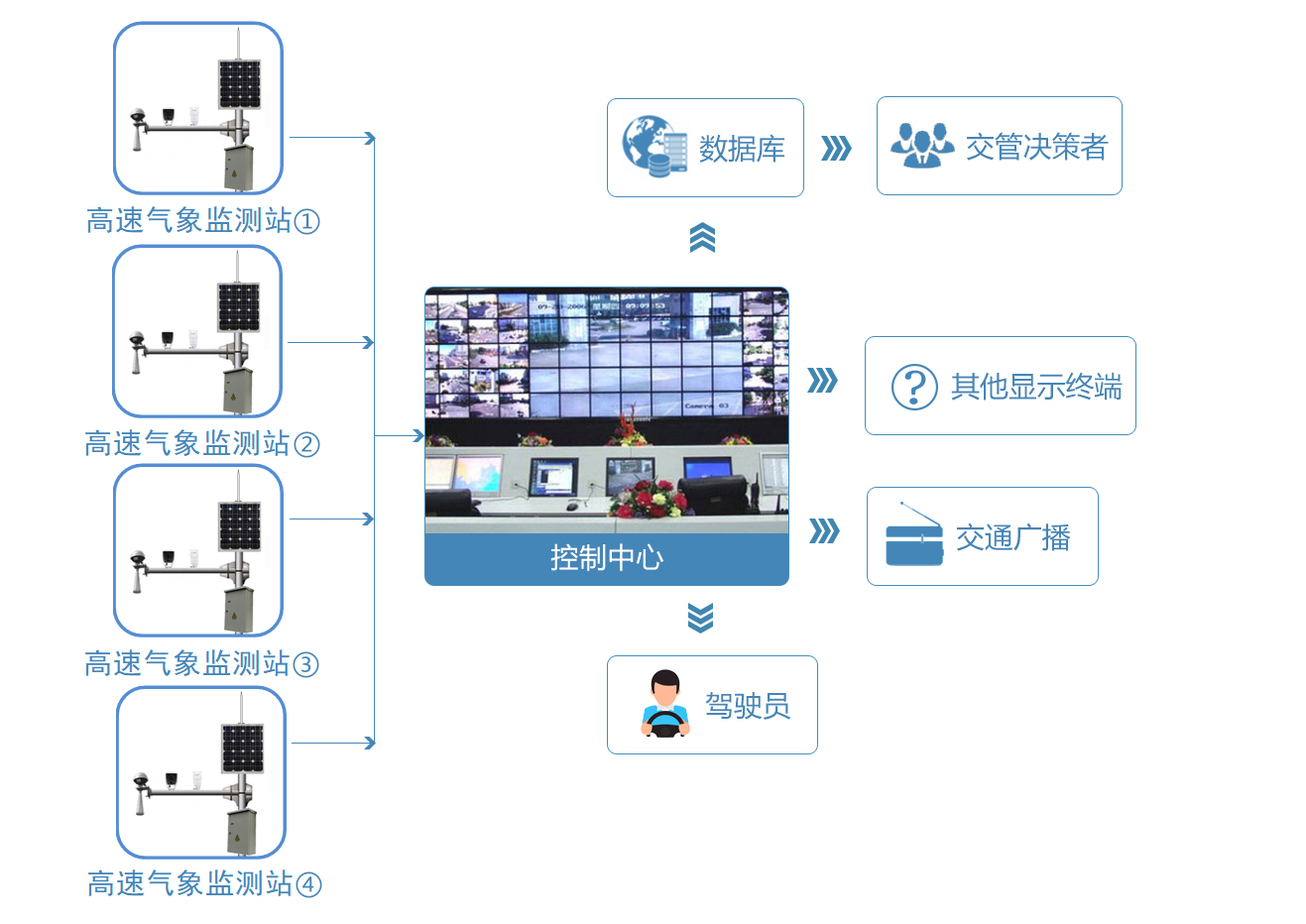 高速公路气象监测预警系统为本公司专门对高速公路气象监测、环境预警特别设计的一套高速公路气象监测预警系统,系统主要由路面状况遥测分析仪、雪厚测量仪、环境传感器、智能数据采集器、专用气象安装支架组成。可通过4G(兼容2G/3G)无线模块或信号线实时传送监测数据到后端控制中心的平台上。确保及时发现各路段及关键点的路况:是否有雨雪天气,道路湿滑状态,是否有结冰和积雪等状况,为气象和交管部门提供准确可靠的科学决策依据。当出现积水、结冰、积雪、霜冻等状况时,能及时发出警示信息,通过多种方式告知管理人员和驾驶员,以提高高速公路安全行车水平。该系统除了实时提供路况气象信息、大气能见度状况数据来保证行车安全,还可以借助对交通道路气象和能见度数据的长期监测,进行数据分析后可为后续高速公路的管理决策提供重要的参考数据。